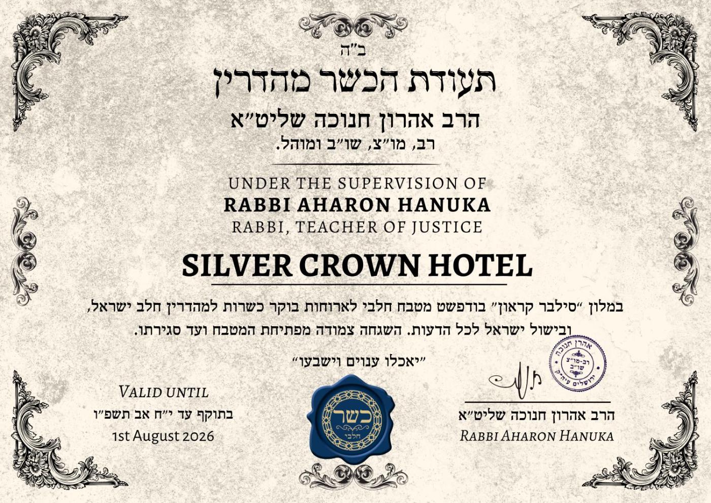 Superior Suite with Kosher Breakfast. Featuring a private entrance, this air-conditioned apartment comprises 1 living room, 1 separate bedroom and 1 bathroom with a bath and a shower. The well-fitted kitchen has a stovetop, a refrigerator, kitchenware and a microwave. This apartment features soundproof walls, a tea and coffee maker, a flat-screen TV with cable channels and a terrace. The unit offers 2 beds. ;